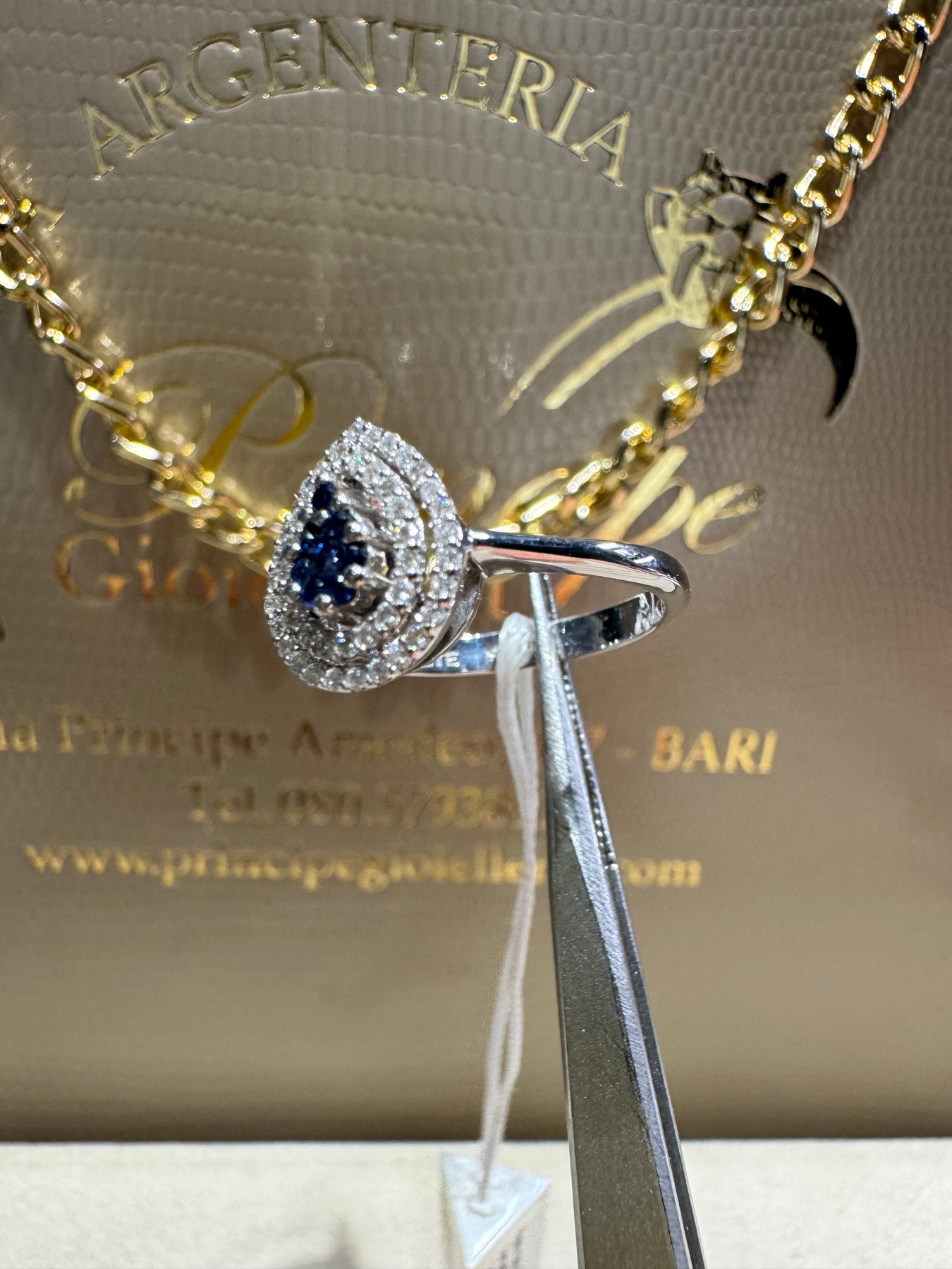 Anello realizzato con gambo massiccio in oro bianco 18kt certificato , Zaffiri e diamanti naturali top quality con certificato.