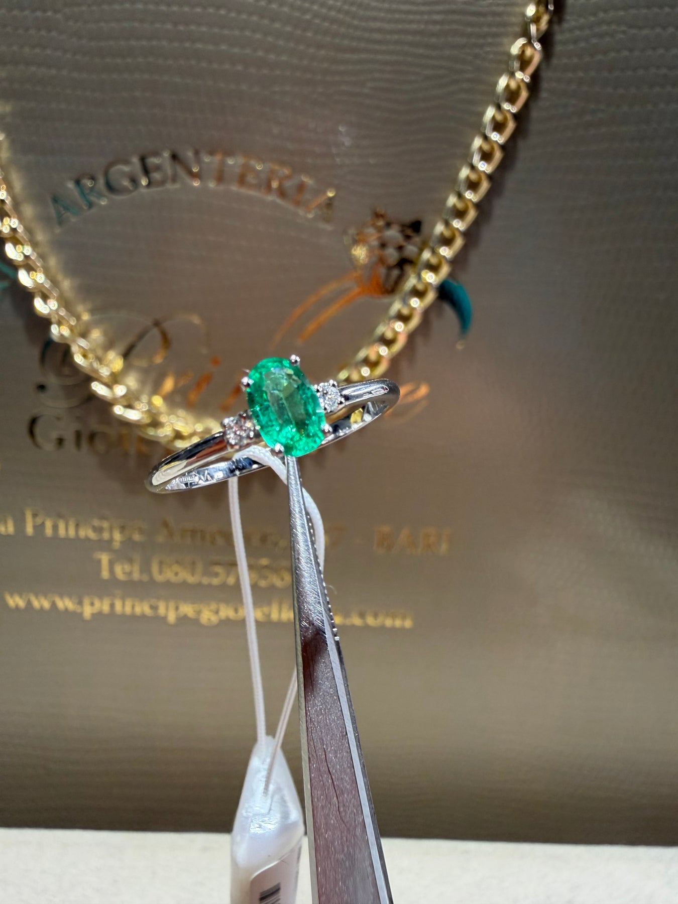 Anello realizzato in oro bianco 18kt con smeraldo e diamanti top quality certificati.